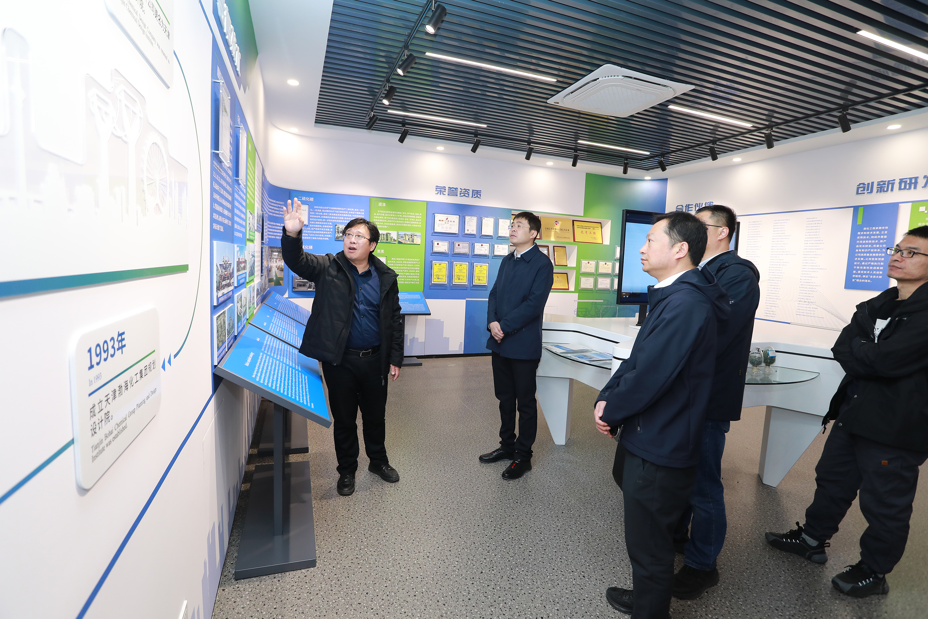 考察團一行首先參觀了渤化工程侯德榜雕像和多媒體展廳,隨后在公司會議室進行溝通交流。蔣澤宇介紹了江河園區(qū)的相關情況,并與渤化工程就該化工園區(qū)中七臺河科技小鎮(zhèn)項目產業(yè)發(fā)展方向、建筑風格,公用配套設施等具體問題進行了交流討論,雙方針對園區(qū)的特點及后續(xù)招商、發(fā)展規(guī)劃等方面進行了深入的探討分析。