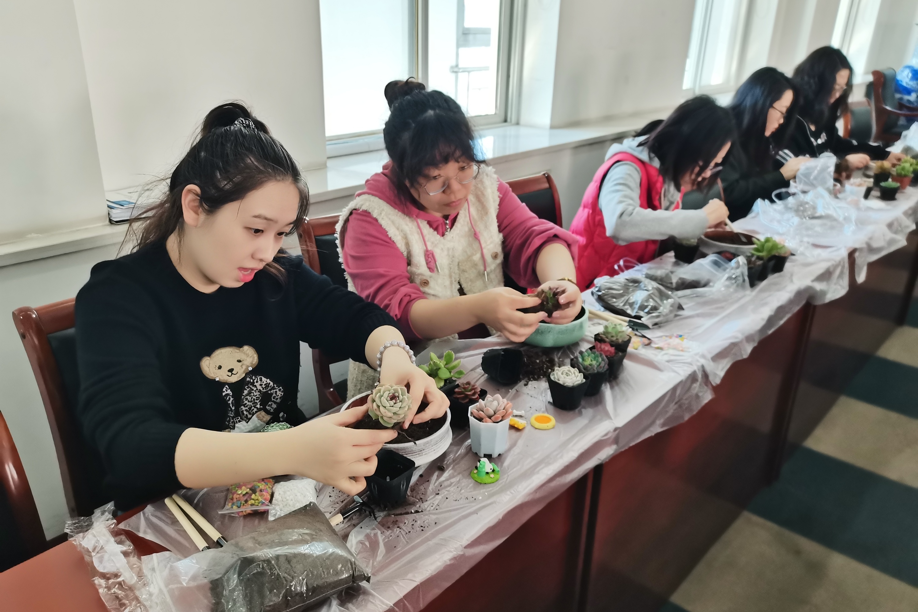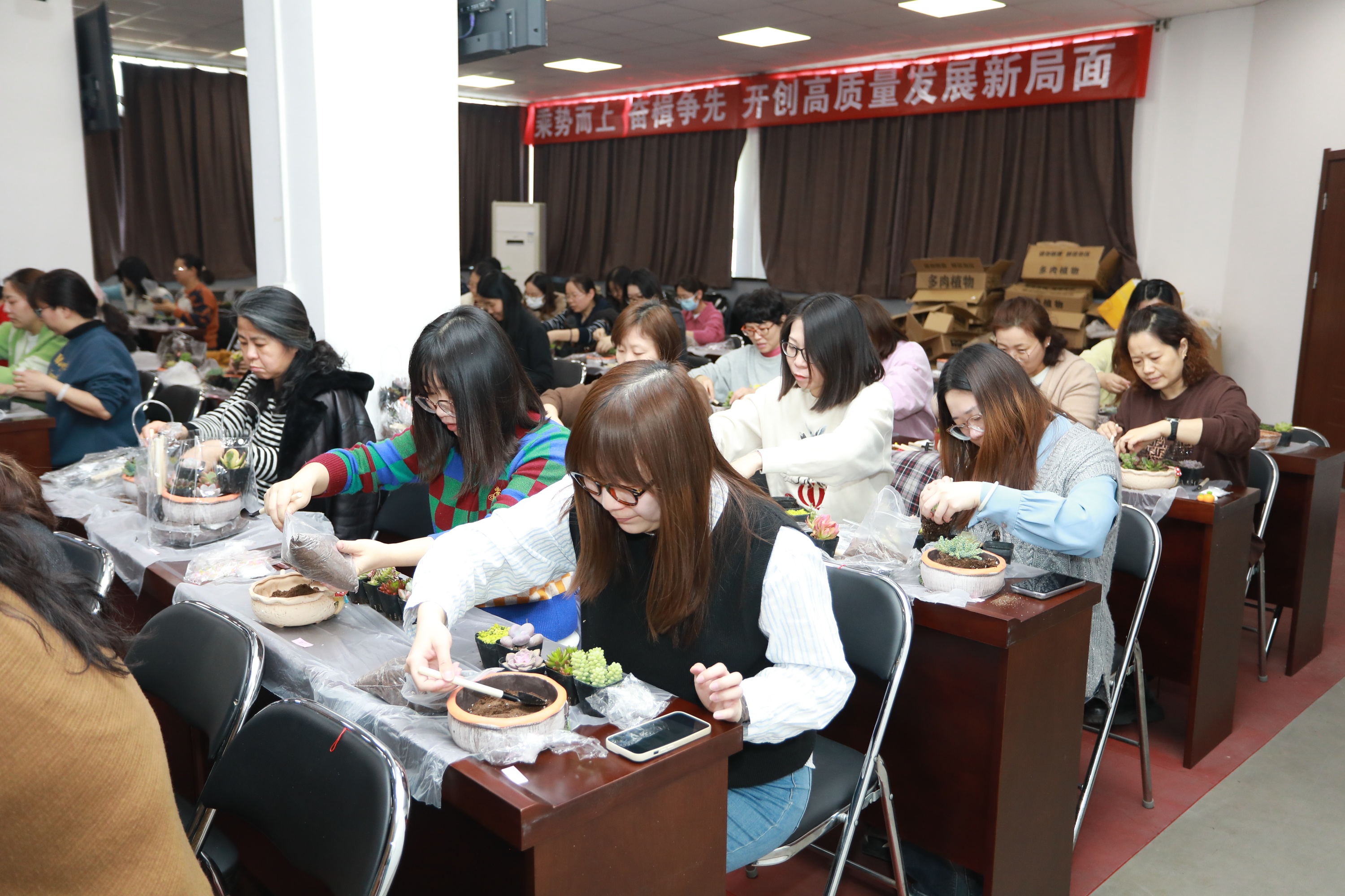 “綠意映紅妝匠心塑春光”——渤化工程 “三八節(jié)”多肉盆栽DIY 2025-03-07 16:35:57 Your browser is not supported 為慶祝第115個(gè)“三八”國(guó)際勞動(dòng)?jì)D女節(jié),豐富女職工精神文化生活,倡導(dǎo)綠色健康生活理念,3月6日渤化工程工會(huì)組織開(kāi)展了“綠意映紅妝匠心塑春光”多肉盆栽DIY主題活動(dòng),百余名女職工齊聚一堂,在春日暖陽(yáng)中感受指尖藝術(shù)與自然之美的融合。 活動(dòng)伊始,專業(yè)園藝?yán)蠋熗ㄟ^(guò)趣味問(wèn)答和案例分享,向女職工們普及了多肉植物的品種特性、養(yǎng)護(hù)技巧及創(chuàng)意盆栽設(shè)計(jì)理念。從土壤配比到澆水頻率,從色彩搭配到空間布局,生動(dòng)實(shí)用的講解讓在場(chǎng)員工躍躍欲試。在DIY環(huán)節(jié),大家化身“園藝設(shè)計(jì)師”,精心挑選吉娃蓮、虹之玉、生石花等萌態(tài)多肉,搭配多彩陶盆、卡通擺件等素材,有的組合出“沙漠花園”的野趣,有的打造出“童話森林”的治愈,將想象力注入方寸綠意之間。 女職工們紛紛表示,此次活動(dòng)不僅讓她們掌握了園藝知識(shí),更體驗(yàn)到動(dòng)手創(chuàng)作的成就感,親手制作盆栽既能減壓又能裝點(diǎn)辦公室,非常有意義。渤化工程工會(huì)以“三八節(jié)”為契機(jī),通過(guò)特色文化活動(dòng)展現(xiàn)女性風(fēng)采,倡導(dǎo)低碳環(huán)保理念,助力打造幸福企業(yè)。